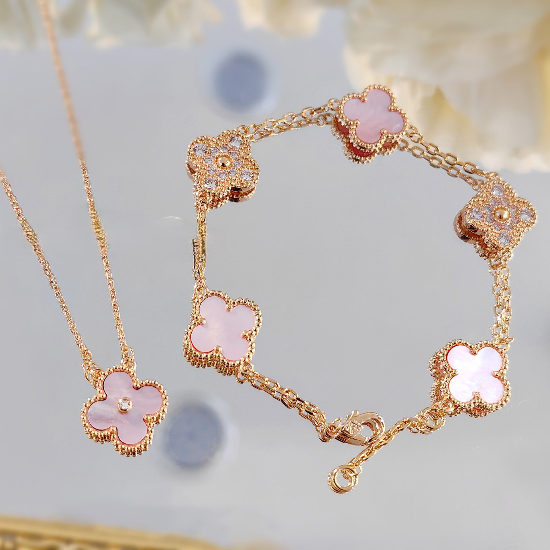 Diamond-studded pink Fritillaria four-leaf clover flower bracelet necklace earrings set