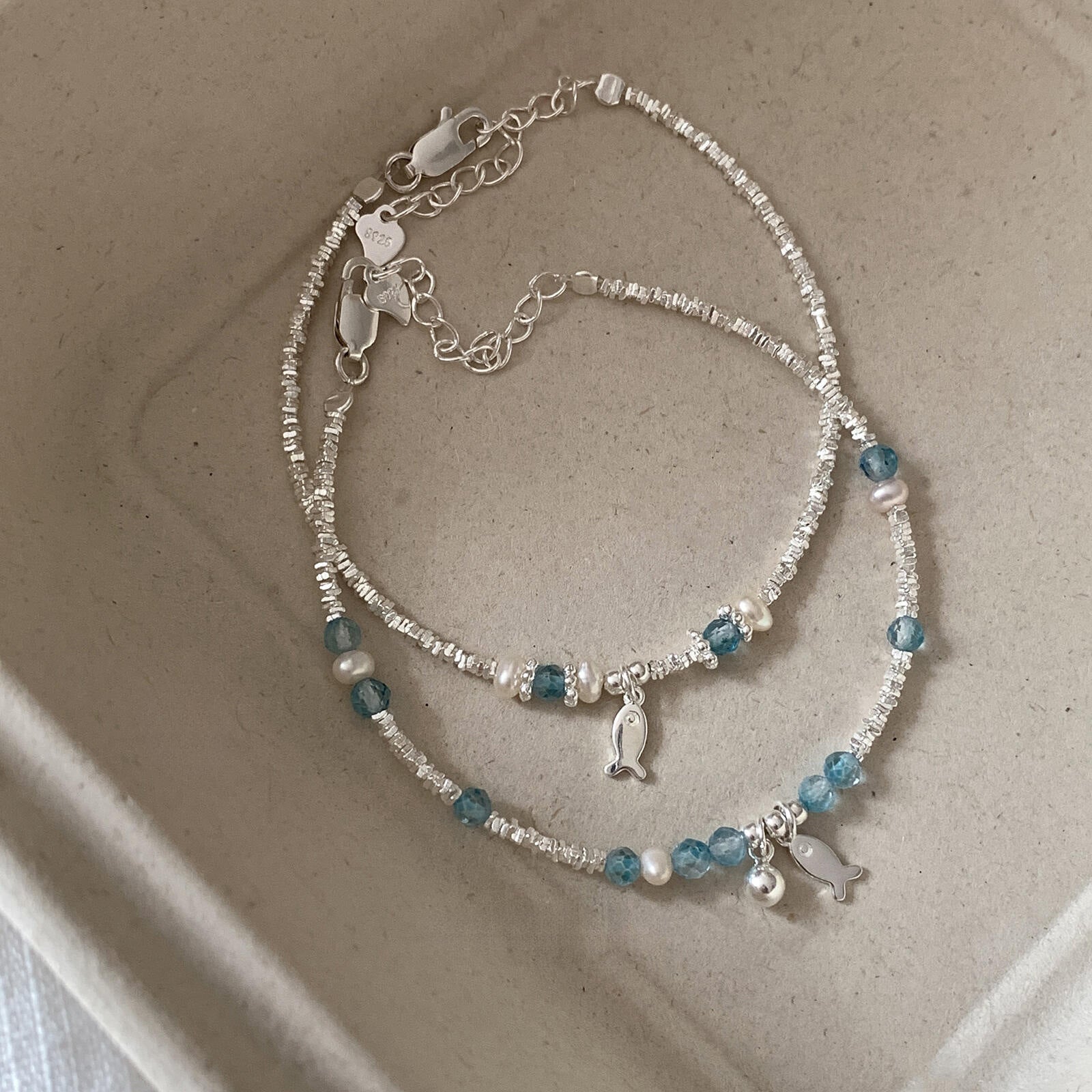 S925 sterling silver blue crystal fish freshwater pearl silver bracelet