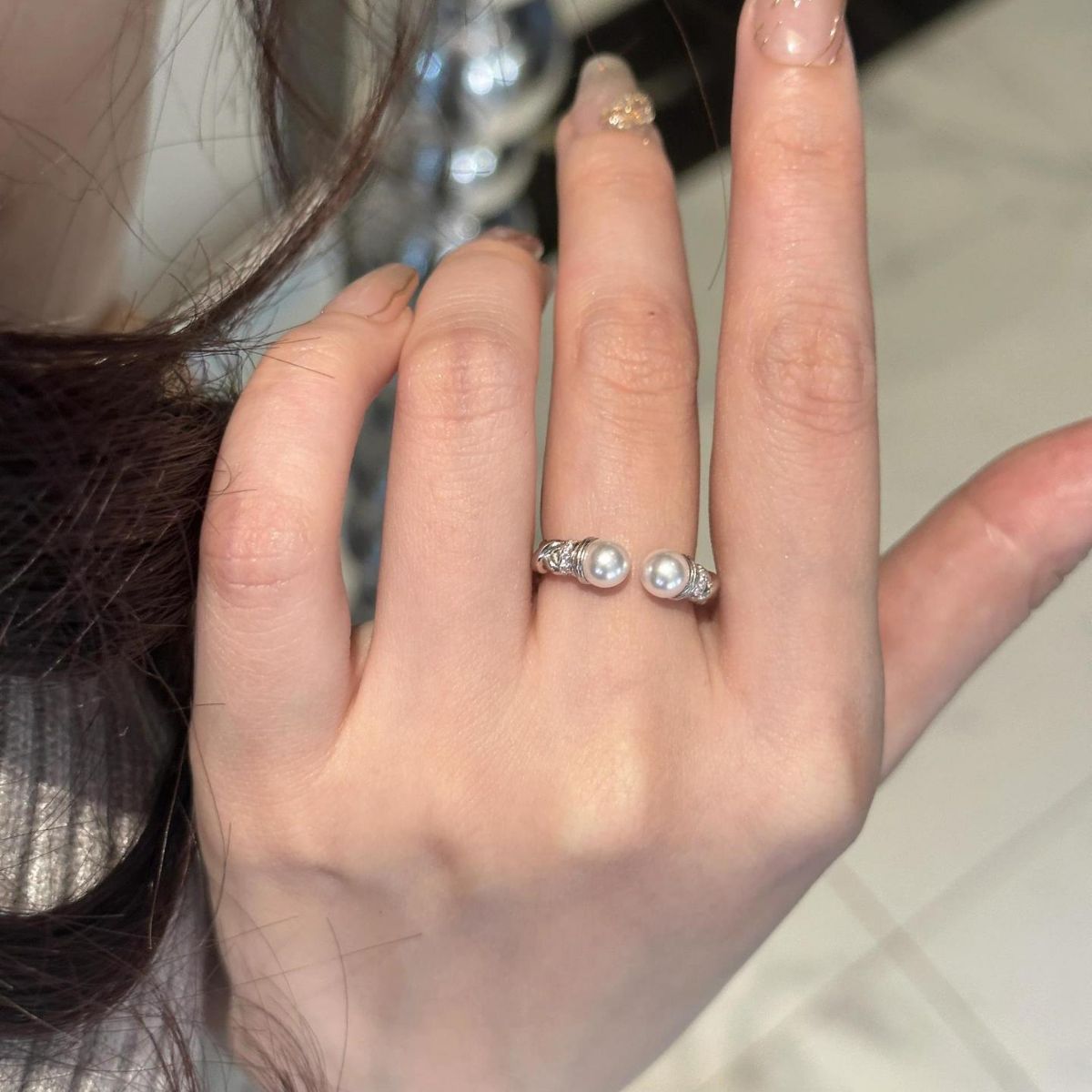 S925 sterling silver Fried Dough Twists pearl ring Swarovski pearl opening adjustable