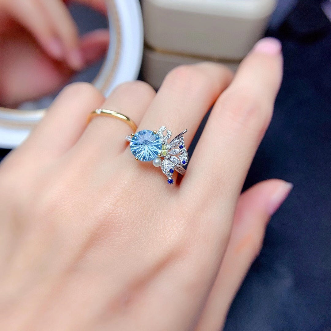 Sky Blue Topaz Fireworks Cut Ring Necklace Butterfly Set